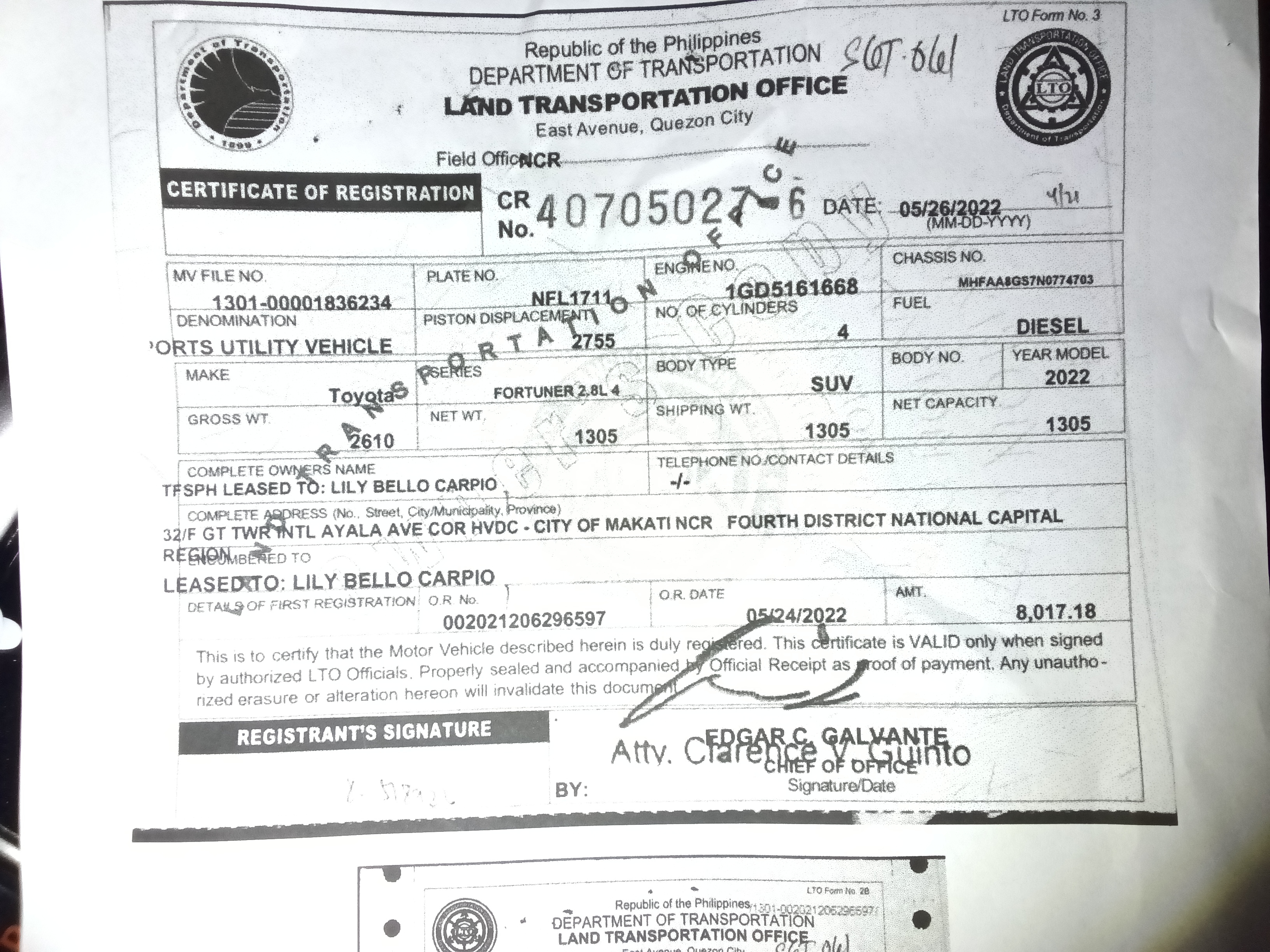 | 6068 | Cabuyao | NFL1711 | MHFAA8GS7N0774703 | 1GD5161668 | Toyota | Fortuner | 2.8 | Q | SUV | A/T | 2022 | White | Auction Yard | Diesel | 52,789 |